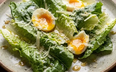 栗原はるみさん直伝!温泉卵入りシーザーサラダ風レシピ。手軽に作れて美味しい、とろーり卵とシャキシャキレタスが絶妙なサラダです。